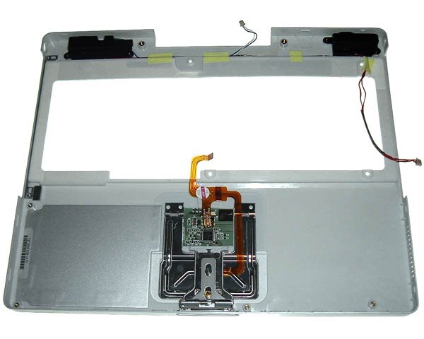 Brand new Apple service spare complete top case for dual USB 12" iBook G3 including palm rest surface, trackpad, trackpad button, trackpad flex cable, speakers & cable, power-on switch & cable and reed switch magnet. This is the pale grey version used on later opaque iBook G3 models. Although functionally interchangeable, the top case on the earlier transparent plastic models were silver,